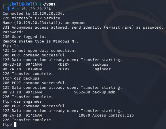Default scripts show that the FTP server allows for anonymous login, inside are two files split between the Backups and Engineer directories. The first being an .mdb (Microsoft Access Database) file and the other, a Zip archive for Access Control information. We are also not allowed to put files onto the server, voiding any possibility of grabbing a reverse shell through the website.