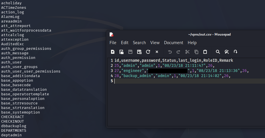 Attempting to unzip the Access_Control.zip file fails due to some type of encryption. I give a go at cracking it with zip2john, however it times out leaving me with no results. On the other hand, we’re able to dump the contents of the backup database by opening Microsoft Access on Windows or using mdbtools on linux.
