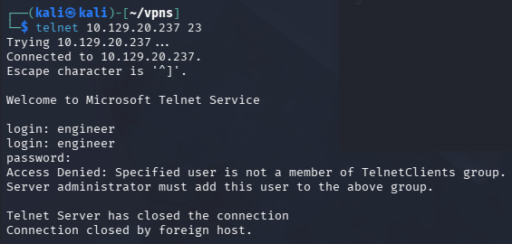 Now that we have credentials, I connect over Telnet which prompts a login. Unfortunately, Using any of the three pairs found in the MDB file do not work here.
