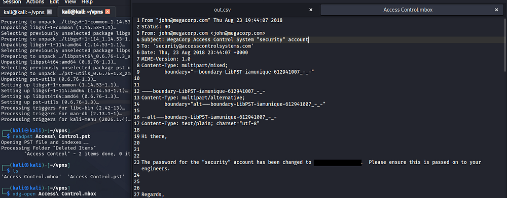Upon using this tool on a .pst file, it will create a copy and convert it to .mbox format which can be opened with the xdg-open command. Inside contains an email memo from John, regarding a password change for the ‘Security’ account.