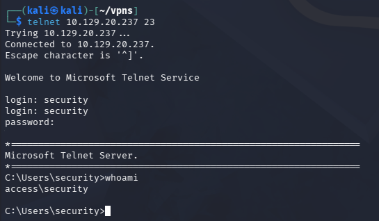 Attempting to use these newfound credentials over Telnet succeeds and we’re granted a shell on the box as the security user.