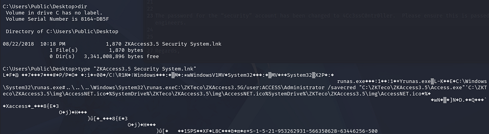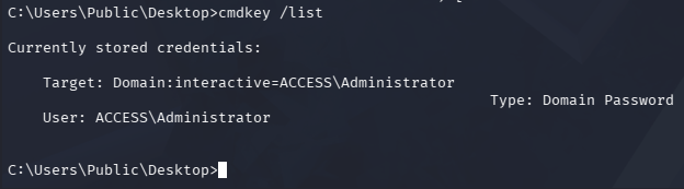 Some light enumeration on the filesystem shows a .lnk file on the Public user’s Desktop folder that executes the runas.exe binary. We can also see that it’s saving the administrator’s credential for us with the access.exe binary later on.