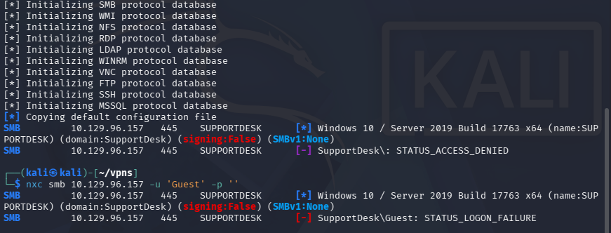 SMB 10.129.96.157 445 SUPPORTDESK [*] Windows 10 / Server 2019 Build 17763 x64 (name:SUPPORTDESK) (domain:SupportDesk) (signing:False) (SMBv1:None)