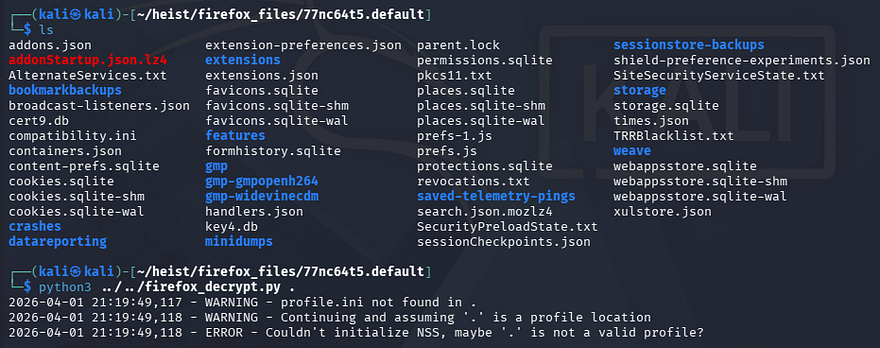 This doesn’t return anything and after further research, Firefox stores encrypted login credentials in a file named logins.json that can be decrypted with key4.db. This profile lacked the logins files so we’re left with nothing.