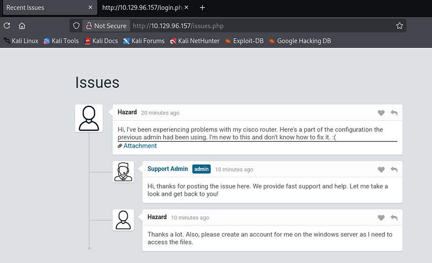 This box is rated easy difficulty on HTB. It involves us finding a Support site that allows guest logins. On the site, we read a chat history between a user and an admin that contains a Cisco router configuration file attached. Cracking the hash and decoding passwords found within lets us spray credentials against a list of usernames found via RID brute-forcing. Finally, we discover that Firefox is installed on the machine and can recover Administrator credentials by dumping process memory and parsing it for POST requests.