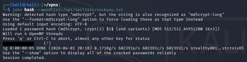 Towards the top of the file, we find an MD5crypt hash along with a few Cisco type 7 encoded passwords for the router and admin logins. If we save that hash to a file and send it over to Hashcat or JohnTheRipper, we’re able to crack it, retrieving the plaintext password.