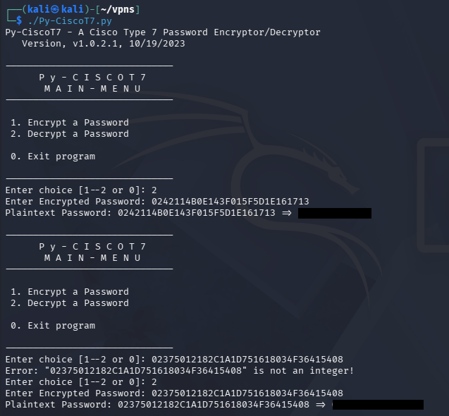 As for the Cisco type 7 encoded passwords, we can search online for tools that will decode them. I find this Github repository that conveniently encodes and decodes strings given so that we can grab these passwords as well.