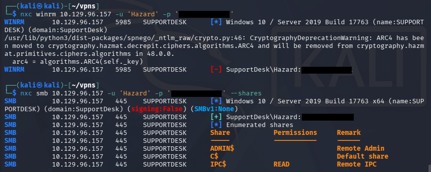 SMB 10.129.96.157 445 SUPPORTDESK [+] SupportDesk\Hazard:[REDACTED]