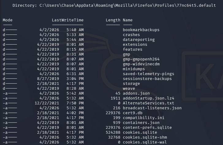 While enumerating Chase’s home directory, I discover a Mozilla Firefox folder within the AppData directory, which is intriguing since it is not the standard for Windows. I discovered this by searching for hidden files recursively and while it clutters the screen with tons of stuff, it can be invaluable for finding stuff like this.