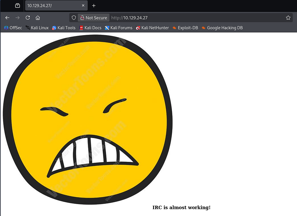 Quickly checking the landing page for the web server just discloses that IRC is almost fully working. My scans don’t find anything else interesting, so I’ll zero in on the IRC server.