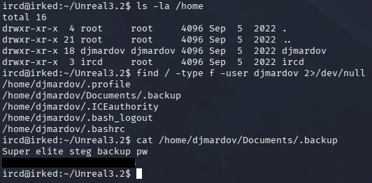 Listing the users on the machine shows just one other account besides root, named djmardov. We have access to read their home directory and by filtering for files, we can discover a hidden backup file in their Documents folder.