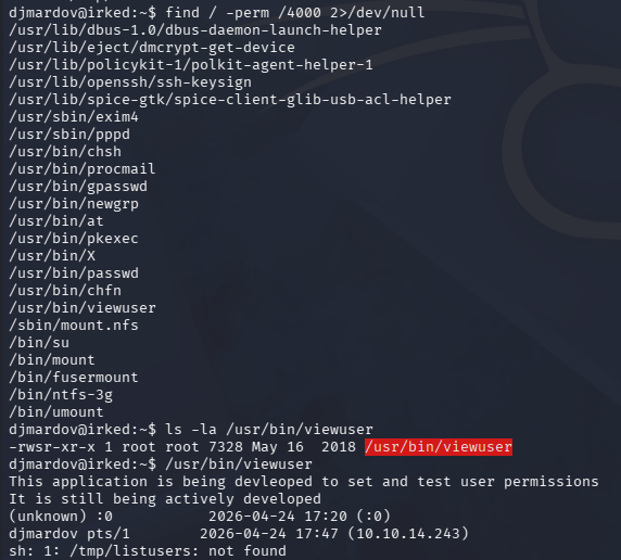 Peeking around the filesystem for any other configuration or backup files does not reveal anything. While checking for binaries with the SUID bit set on them, I discover a custom one named viewuser which seems to be in development in order to test and set user permissions.