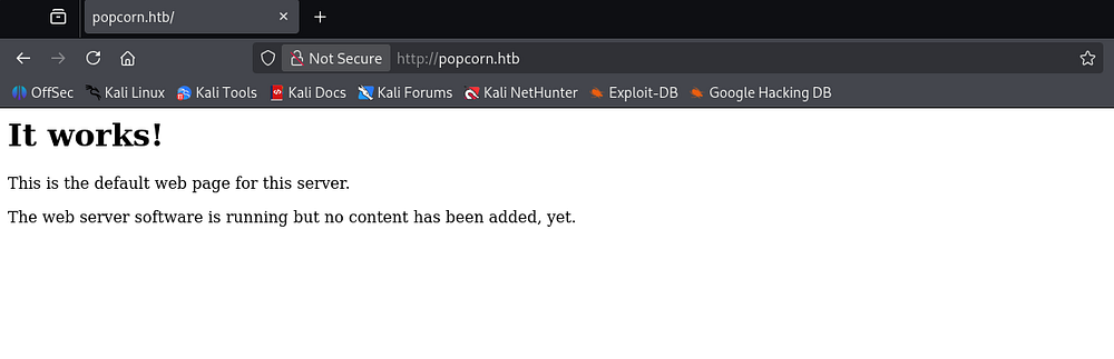 Not a whole lot we can do with that version of OpenSSH without credentials so I’ll focus on the web components. Default scripts show that the site is redirecting us to popcorn.htb which I add to my /etc/hosts file.