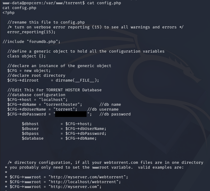 Since we landed on the system as the web service user, we generally won’t have many special binary permissions or privileged actions. However, there was a place to login at the Torrent Hoster application and we should own it, so I head over to the web root’s directory to dump the config file.