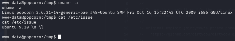 Displaying the Linux Kernel version reveals that it is extremely old (around September, 2009), making it vulnerable to quite a few dangerous privilege escalation exploits. I proceed with using DirtyCow, aka. CVE-2016–5195, which is a Linux privilege escalation vulnerability that exploits a race condition in the copy-on-write (COW) mechanism of memory management. It allows a local attacker to gain write access to read-only files, potentially modifying system binaries and escalating privileges to root.
