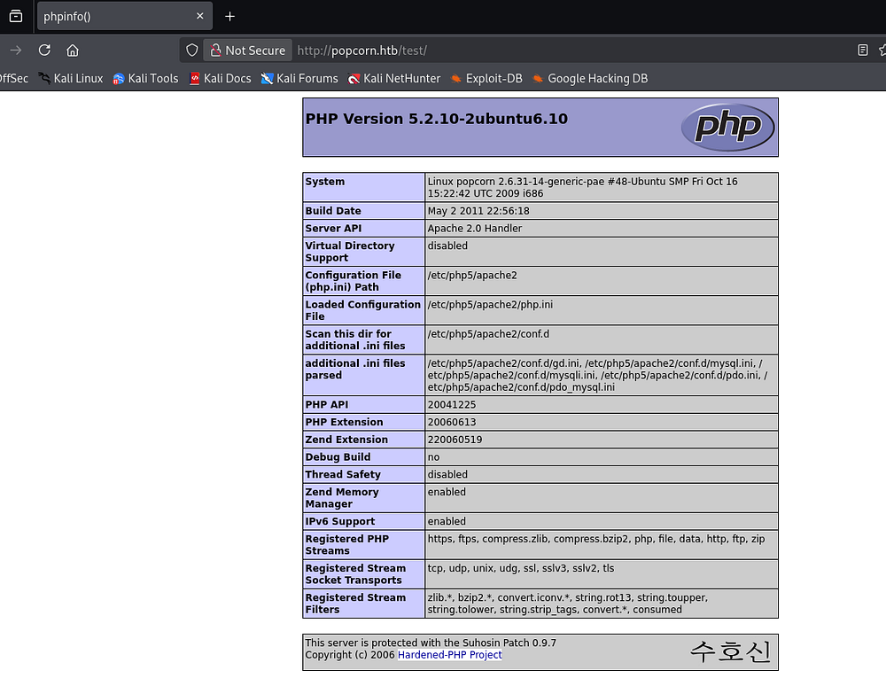 Second is a test page that holds the web server’s phpinfo() page. This is very useful for discovering critical information about the Apache environment.