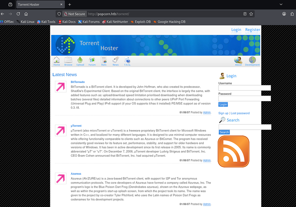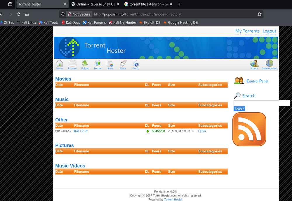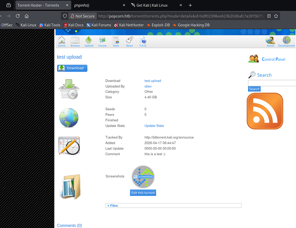 From the looks of it so far, we most likely need to upload a file via this torrent hosting application and then use the API to either overwrite another file or expose it to get a reverse shell in order to get a foothold. I start by registering an account on the site, this shows that only one torrent file containing a Kali Linux ISO has been uploaded to the site.