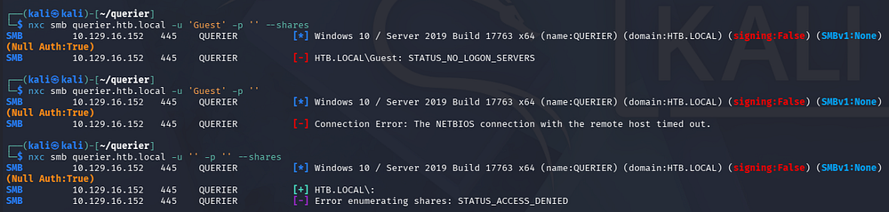 $ nxc smb querier.htb.local -u 'Guest' -p ''