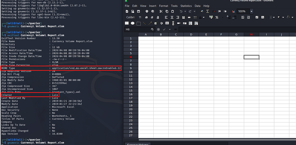 After grabbing that file, I open the document using Gnumeric (a lightweight, open-source spreadsheet application built for Unix/Linux systems). You can install this tool with sudo apt install gnumeric on Kali since there isn’t a default tool that supports this archive.