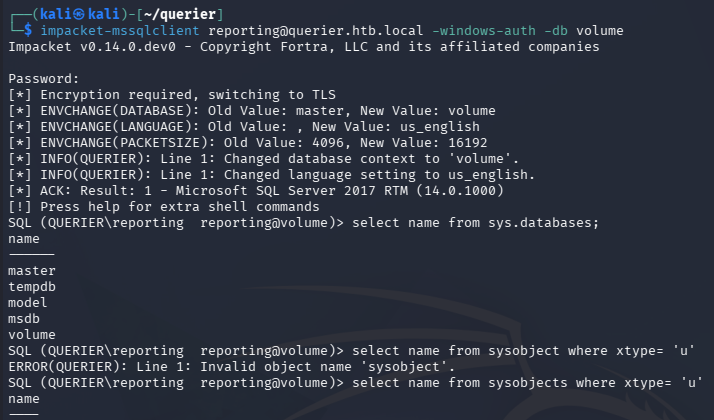 $ impacket-mssqlclient reporting@querier.htb.local -windows-auth -db volume