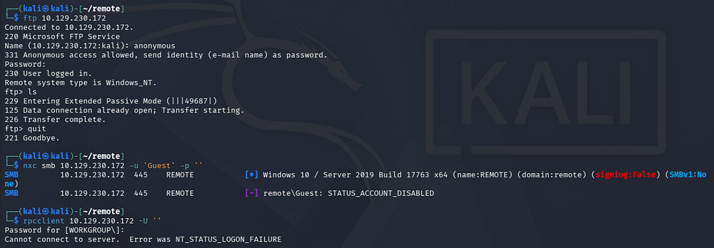 Looks like a Windows machine with a few interesting ports open. I’ll mainly focus on FTP, SMB, and NFS before enumerating the web server as they could hold invaluable information to use there. With that being said, I fire up Ffuf to search for subdirectories and Vhosts in the background to save on time.