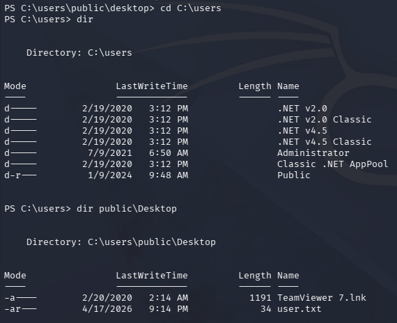 Checking the Users directory shows that the only real person on this system is the administrator. We can grab the user flag under the Public user’s Desktop folder too.
