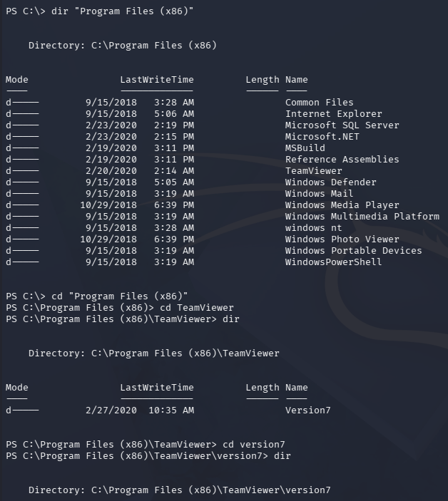 Light enumeration on the filesystem reveals that TeamViewer is installed under C:\Program Files (x86) and seems to be running version 7.