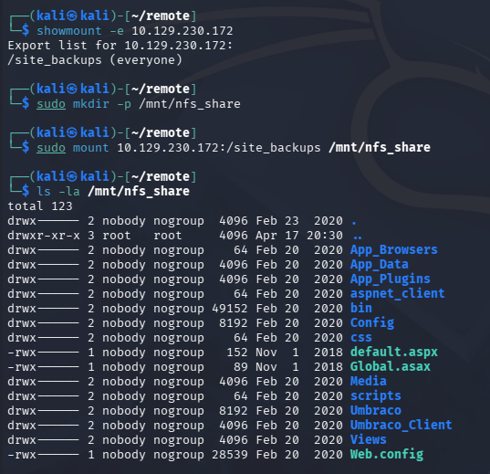 This box is rated easy difficulty on HTB. It involves us discovering an NFS share which can be mounted to grab a backup of the website. Digging through the source files, we find an Administrator hash to the Umbraco CMS instance that can be cracked and used to login. Once on the dashboard, we notice that the CMS version is vulnerable to authenticated RCE, letting us get a reverse shell as defaultapppool. Finally, TeamViewer is installed on the machine and let’s us the administrator’s password by decrypting it with a static AES key and IV.