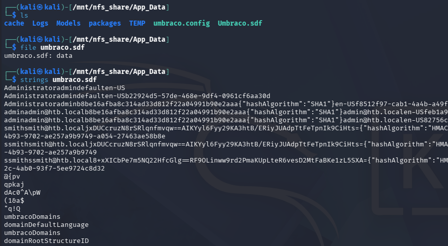 With a site backup on our machine, we find an Umbraco CMS instance installed on the site. Inside of the /App_Data directory is an .sdf (Structured Data File) that gives us a few hashes when grabbing the strings from it.