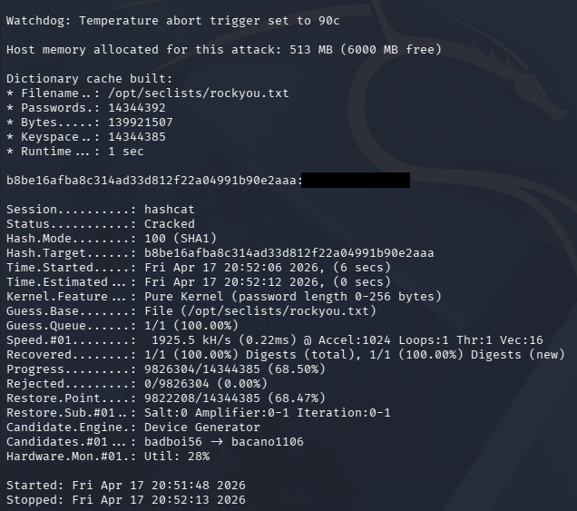 $ hashcat -m 100 hashes /opt/seclists/rockyou.txt --force