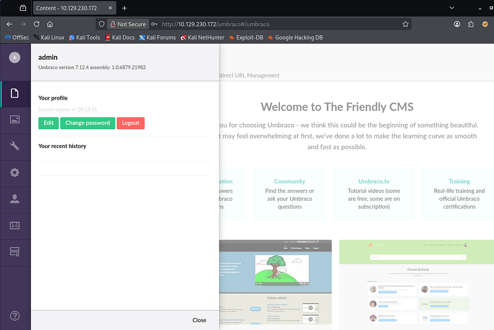 Sending them over to Hashcat only cracks the Administrator’s since it was using SHA1, now letting us login to the Umbraco site with elevated permissions.